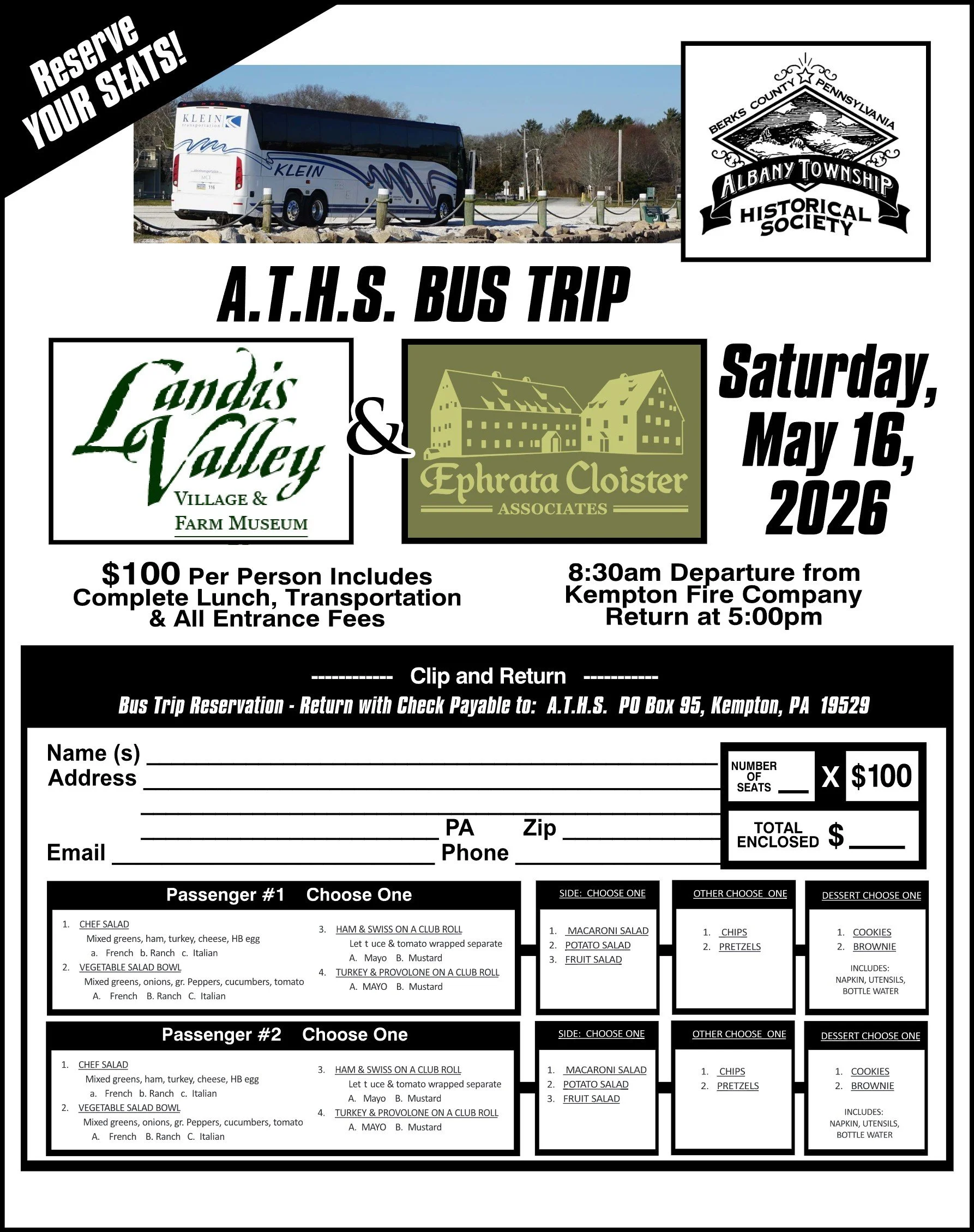 IMPORTANT - Please send your reservation in by mail along with your check payable to A.T.H.S., PO Box 95, Kempton, PA 19529. Please make sure to include your lunch choices.